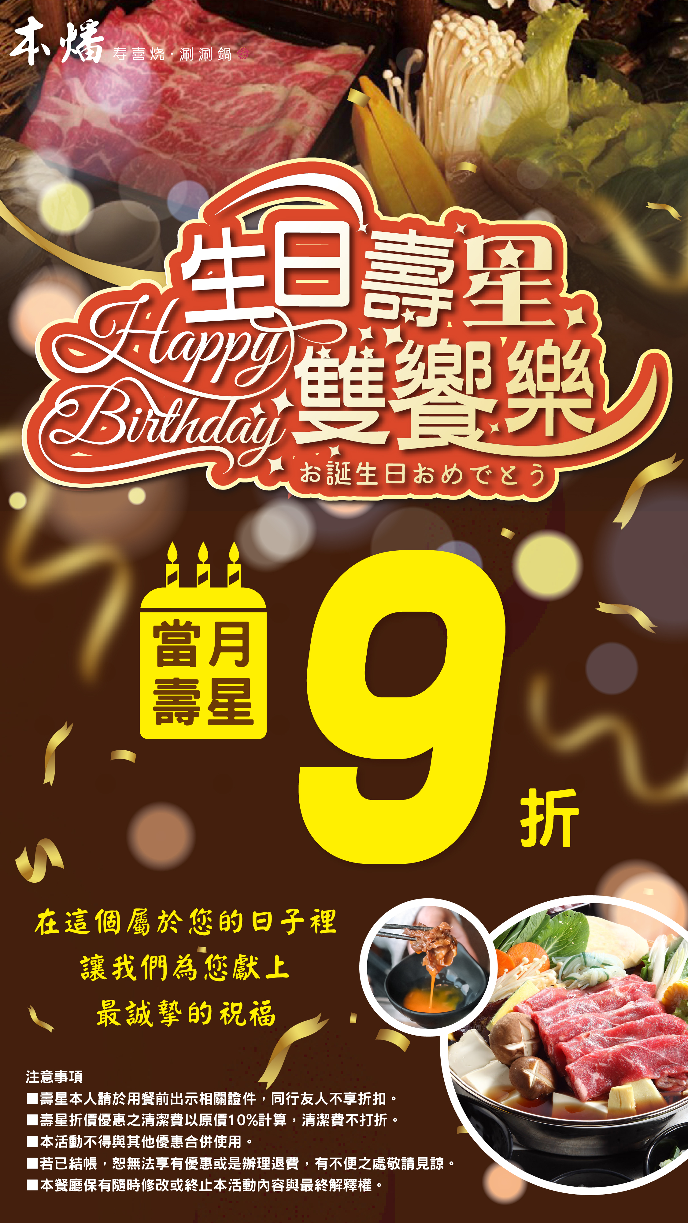 出示證件享當月壽星9折。 注意事項 ■壽星本人請於用餐前出示相關證件,同行友人不享折扣。 ■壽星折價優惠之清潔費以原價10%計算,清潔費不打折。 ■本活動不得與其他優惠合併使用。 ■若已結帳,恕無法享有優惠或是辦理退費,有不便之處敬請見諒。 ■本餐廳保有隨時修改或終止本活動內容與最終解釋權。