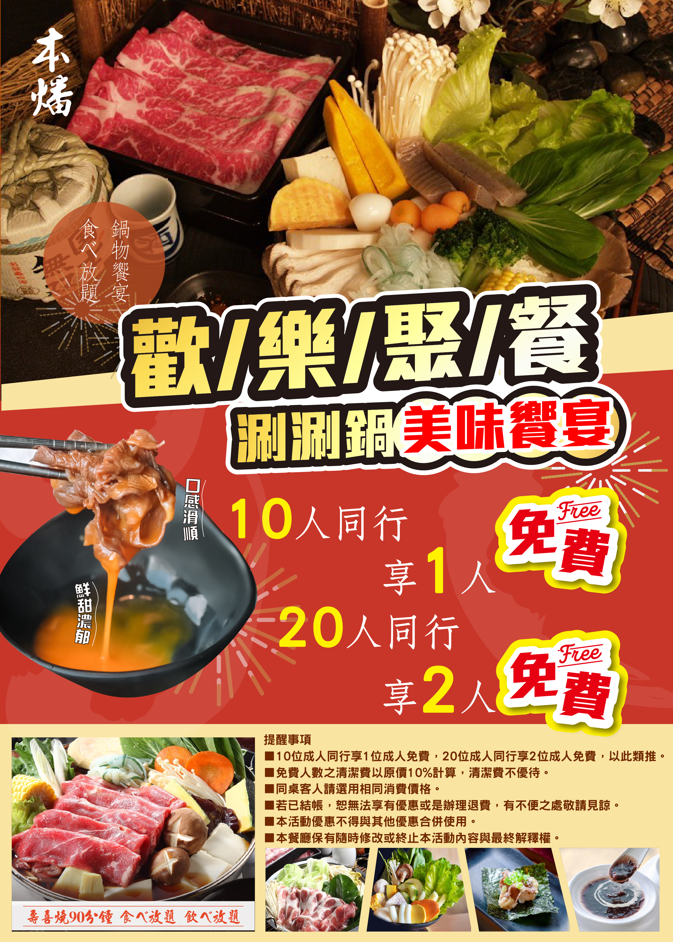 提醒事項 ■10位成人同行享1位成人免費,20位成人同行享2位成人免費,以此類推。 ■免費人數之清潔費以原價10%計算,清潔費不優待。 ■同桌客人請選用相同消費價格。 ■若已結帳,恕無法享有優惠或是辦理退費,有不便之處敬請見諒。 ■本活動優惠不得與其他優惠合併使用。 ■本餐廳保有隨時修改或終止本活動內容與最終解釋權。 -